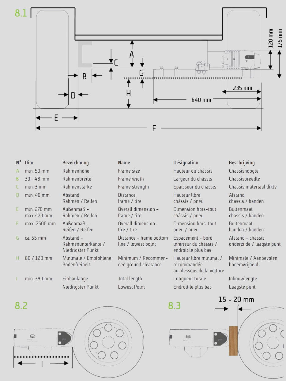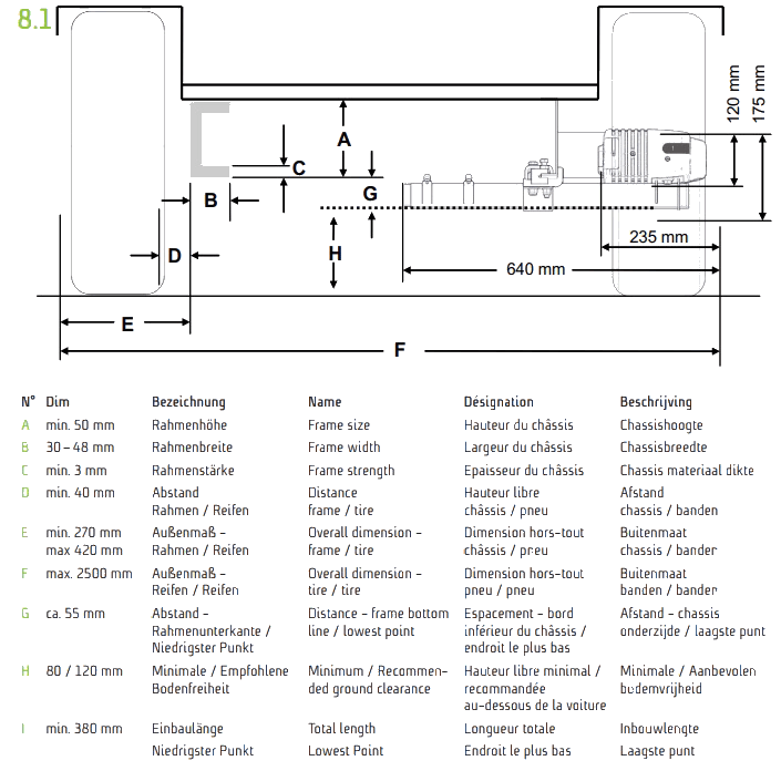 La altura de instalación es 12,00 cm. Pierde la distancia al suelo cuando se monta en un chasis adecuado 5,70 cm. El motor necesita una longitud de instalación de 36,00 cm. Las piezas metálicas están galvanizadas. El motor de accionamiento tiene 2 Escobillas de carbón. Este motor ha sido introducido en 2021.